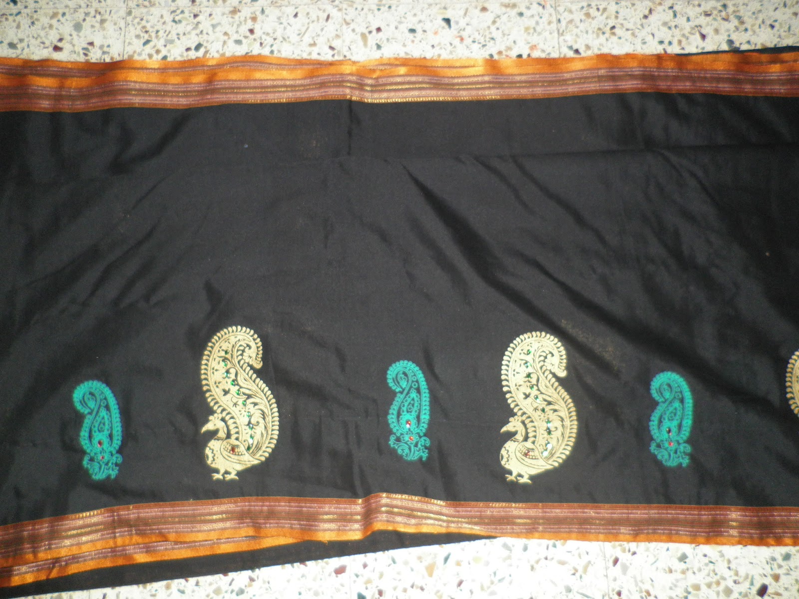 This is a plain black saree with Golden Yellow border. The owner of this saree likes very simple designs. So printed this with Peacock and Paisley designs , in Green and Gold color. Attached Green and red kundans